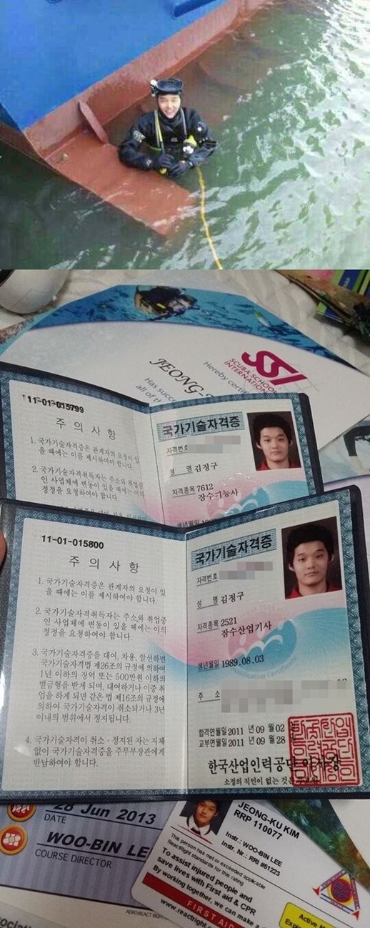 MBC공채 20기 개그맨 김정구가 민간잠수부로 진도 세월호 침몰 사고 현장에 합류했다.김정구는 18일 오전 45분께 "현장 도착했습니다. 돕고 오겠습니다. 이제 휴대폰을 잘 못 볼 것 같아요"라는 글을 게재했다.앞서 김정구는 17일 밤 자신의 페이스북에 "조그만 도움이라도 되고자 진도로 자원봉사 가는 길입니다. 아이들도 저도 무사할 수 있도록 기도해주세요"라는 글을 올리며 진도로 떠난다는 사실을 전했다.이어 18일 새벽 "많은 응원과 걱정 해주셔서 감사합니다. 궁금해하시는 분들이 많아 글을 올립니다. 제가 출발할 당시 목포, 진도행 차가 없어 현재 광주터미널에 와있고 이곳에서 밤을 새고 첫차로 진도를 가서 다이버 팀에 합류하려합니다"라고 전했다.김정구는 한국폴리텍3대학 강릉캠퍼스에서 산업잠수과를 전공했으며 잠수산업기사, 잠수기능사 국가기술자격증을 보유하고 있다.한편, 16일 오전 전남 진도 인근 해상에서 발생한 세월호 침몰 사고로 18일 오전 10시 현재 탑승인원 총 475명 중 사망자 25명, 구조자 179명, 실종자는 271명이다.[사진=김정구 페이스북]