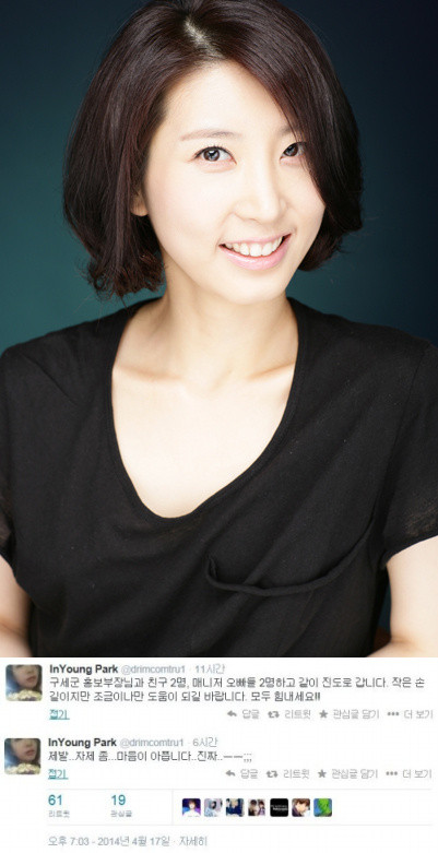 세월호 침몰 사고 현장 전남 진도로 봉사활동을 떠난 박인영이 일부 악플러들을 향해 호소의 목소리를 높였다.배우 박인영은 18일 자신의 트위터에 "제발.. 자제 좀... 마음이 아픕니다.. 진짜"라는 짤막한 글을 게재했다.앞서 박인영은 트위터를 통해 "구세군 홍보부장님과 친구 2명, 매니저 오빠들 2명하고 같이 진도로 갑니다. 작은 손길이지만 조금이나마 도움이 되길 바랍니다. 모두 힘내세요"라는 글을 남기며 세월호 구조 현장에 간다는 소식을 알렸다.하지만 박인영의 봉사활동 참여 소식에 일부 네티즌들은 비아냥거리는 댓글을 달며 비인간적인 반응을 보였다. 이에 박인영이 안타까운 심경을 전한 것.이를 접한 네티즌들은 "좋은 일 하는데 너무 하네", "박인영 신경 쓰지 마세요", "박인영 응원합니다", "박인영 자원봉사 칭찬받아 마땅한 일", "악플러들 정말 이해 안 된다" 등의 반응을 보였다.한편, 18일 오후 6시30분 현재 기준으로 전체 승객 475명 중 구조 179명, 사망 28명, 실종 268명으로 집계됐다[박인영, 사진=마스크엔터테인먼트/박인영 트위터 캡처]