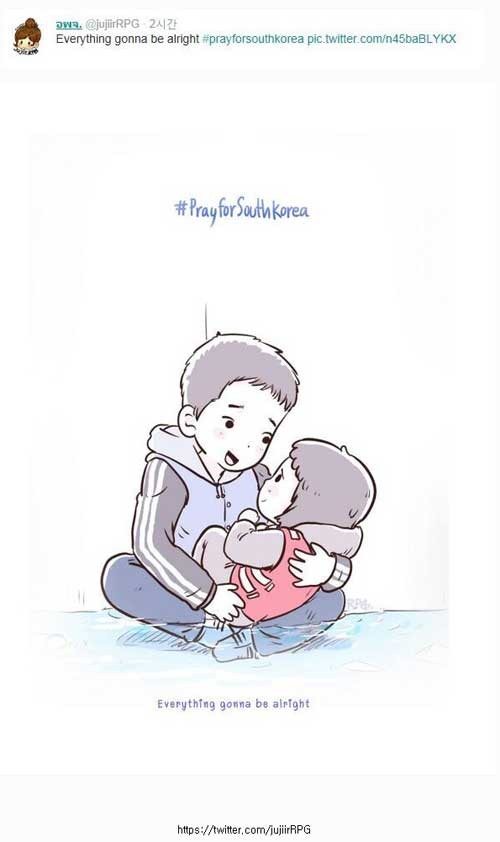 세월호 여객선 침몰 과정에서 드러난 다섯살 여동생과 여섯살 오빠의 사연이 전세계를 울렸다.권지연(5)양은 아버지와 어머니, 오빠와 함께 세월호에 탑승했지만 홀로 구조됐다. 사고 당시 권 양의 여섯살 오빠는 입고 있던 구명조끼를 어린 동생에 입혀준 뒤 탈출을 도왔다. 여섯살 오빠가 부모님을 찾으러 간 사이 배에는 빠르게 물이 차올랐고 권 양만 극적으로 구조된 것. 부모님과 권 양의 오빠는 실종된 상태다.지난 17일 인터넷에 권 양과 오빠의 모습을 그린 그림이 올라왔다. 그림은 물이 차오르는 바닥에 앉은 남자 아이가 어린 여자아이와 눈을 마주치며 따뜻한 눈빛으로 바라보는 모습이다. 사연처럼 구명조끼는 어린 여자아이만 입고 있다.세월호 사건 직후 개설된 트위터 '한국을 위해 기도합니다'(PrayforSouthKorea)에 게재된 그림은 태국인 여성 네티즌이 그려 올린 것으로 알려졌다. 그림은 인터넷과 SNS 곳곳으로 퍼져나가며 네티즌의 심금을 울리고 있다.사고 당시 권 양 가족은 서울 생활을 정리하고 감귤 농사를 짓기 위해 제주로 귀농하던 길이었다. 권 양은 할머니와 함께 18일 집에 돌아간 것으로 전해졌다.[뉴데일리=윤희성 기자 ndy@newdaily.co.kr]