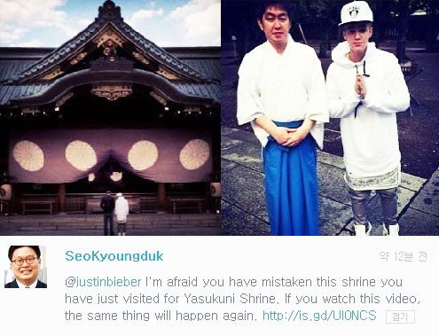 한국 홍보 전문가 서경덕 성신여대 교수가 팝스타 저스틴 비버에게 일침을 날렸다.23일 저스틴비버가 자신의 인스타그램에 야스쿠니 신사 참배를 하는 사진을 올려 큰 논란을 일으켰다. 이에 저스틴 비버의 트위터 등 SNS계정에 서 교수가 글과 함께 유튜브에 올린 영어 동영상을 함께 링크했다.이에 서경덕 교수는 "저스틴 비버가 야스쿠니 신사에 대해 잘 몰라서 그랬을 것이다. 그렇기에 그냥 비판과 비난만 할 것이 아니라 야스쿠니 신사에 대한 정확한 정보를 알려주는 것이 더 중요하다고 판단했다"고 밝혔다.이어 "지난 2월 야스쿠니 신사 관련 동영상을 만들기 위해 도쿄를 방문했을 때도 아무것도 모르는 외국인들이 야스쿠니 신사 앞에서 목례하는 것을 보고 전 세계에 제대로 알려야겠다고 다짐했다"고 덧붙였다.특히, 서 교수는 저스틴비버의 SNS 계정뿐만이 아니라 24일 오전 야스쿠니 신사 관련 영어 동영상 CD와 영문 자료집을 모아 저스틴비버 소속사로 우편물도 보냈다.현재 해명글을 올린 저스틴 비버는 "나는 야스쿠니 신사가 기도하는 곳으로만 착각했다. 기분 상한 분들이 있다면 죄송하다"며 "난 중국과 일본을 사랑한다"고 전했다.서 교수는 "해명글에 한국을 제외한 것이 좀 아쉽지만 이번 기회에 저스틴 비버 및 많은 서양인들에게 야스쿠니 신사참배의 문제점을 더 널리 알릴수 있도록 하는 좋은 계기로 삼아야 한다"고 강조했다.한편 야스쿠니 신사참배 관련 동영상은 22일 유튜브를 통해 한국어와 영어로 동시에 공개됐다.[사진=저스틴비버 인스타그램/ 서경덕 교수 트위터 캡처]