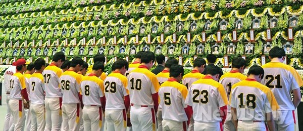 [포토]'묵념하는 무거운 마음' 임시 합동분향소 조문 온 어느 학교의 야구부 학생들
