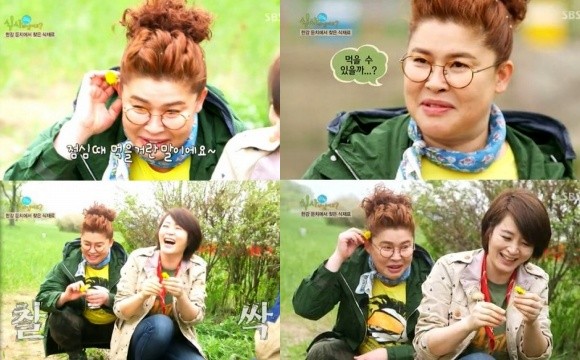 이날 여행을 떠나기 전 세 사람은 한강 둔치에서 식재료를 찾아 나섰다. 이영자는 민들레꽃을 보고 점심에 먹겠다며 머리에 꽂았다.