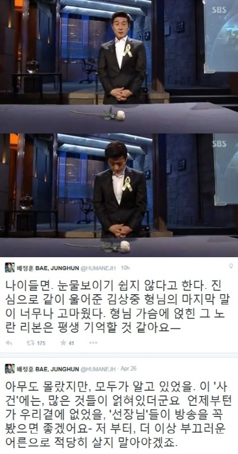 배정훈 PD는 26일 자신의 트위터에 "나이 들면 눈물 보이기 쉽지 않다고 한다. 진심으로 같이 울어준 김상중 형님의 마지막 말이 너무나 고마웠다. 형님 가슴에 얹힌 그 노란 리본은 평생 기억할 것 같아요"라는 글을 게재했다.