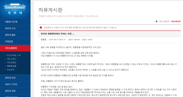 정홍원 총리가 사의를 표명한 27일 오전부터 청와대 홈페이지 자유게시판 불만글이 줄을 이으면서 부터다.