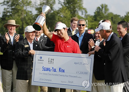 노승열 PGA 첫 우승한국의 영건 노승열(23·나이키골프)이 미국프로골프(PGA) 투어에 진출한 지 만 2년 만에 처음으로 우승컵을 들어올렸다.노승열은 28일(한국시간) 끝난 취리히 클래식에서 미국의 스트랩과 스보보다를 두 타 차로 따돌리고 생애 첫 PGA 투어 우승컵을 품에 안으며 12억7천만 원의 상금을 거머쥐었다. 노승열 PGA 첫 우승은 한국 선수로는 최경주와 양용은, 배상문에 이어 네 번째이고 최연소 우승이다.노승열은 세월호 희생자들을 추모하고 기적을 바라는 마음에서 나흘 내내 노란 리본을 모자에 달고 출전했다. 사흘 동안 보기 없이 버디만 18개를 잡아낸 노승열의 샷은 강한 바람과 압박감 속에서도 흔들리지 않았다.이날 1번 홀을 불안하게 보기로 출발했지만, 이후 버디 4개와 보기 2개를 더해 한 타를 더 줄였다. 특히, 16번 홀 워터해저드를 옆에 두고 과감하게 핀을 공략해 버디를 잡아낸 게 결정타였다.PGA 첫 우승을 차지한 노승열은 경기 후 인터뷰에서 "세월호 침몰 사고가 발생한 직후 금요일 출국했다. 마음이 무거웠고, 안타까운 사고로 슬픔에 빠진 분들과 고통을 받는 분들을 위해서 멀리서나마 희망과 기쁨을 줄 수 있도록 최선을 다해서 경기했다"고 밝혔다.이어 "사고가 난지 많은 시간이 지났지만 정말로 기적이 일어나서 애타게 기다리고 있는 실종자들이 가족 품으로 돌아가기를 기원하겠다"고 전했다.한편, 노승열은 이번 대회에서 우승을 하면서 플레이어스 챔피언십 등 참가 자격이 없었던 대회에도 참가할 수 있게 됐다. 웰스 파고 챔피언십과 그 다음주 플레이어스 챔피언십에 참가해 PGA 투어 2승에 도전한다.[노승열 PGA 첫 우승, 사진=연합뉴스]