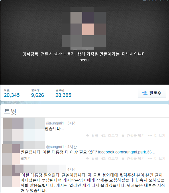 자신을 영화감독이라고 소개한 박 씨는 이날 자신의 트위터를 통해 "(청와대 홈페이지 게시글에 달린)댓글들은 대부분 저장해 두었다"며 "게시판이 열리면 제가 다시 글을 올리겠다"고 밝혔다.