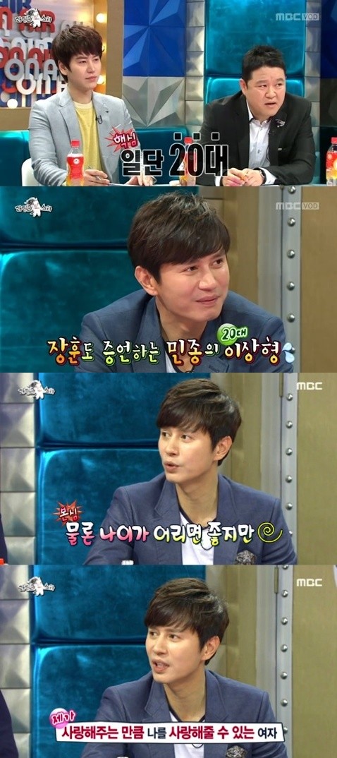 배우 김민종이 이상형을 고백했다.지난 4월 30일 방송된 MBC '황금어장-라디오스타'에는 '등 떠밀려 나온 사람들' 특집으로 배우 김민종, 전 농구선수 서장훈, 방송인 전현무, 걸그룹 씨스타 소유가 출연해 솔직한 입담을 뽐냈다.이날 전현무는 김민종과의 첫 만남을 언급하며 "SM에 대해 상의하려 했는데 그 얘기 10분하고 계속 여자 얘기만 하셨다"라며 "소유가 김민종이 내게 말한 이상형에 굉장히 근접하다"고 말했다.이에 소유는 이상형에 대해 물었고, 김민종이 대답하기 전에 김구라는 "일단 20대"라고 폭로해 김민종을 당황하게 만들었다.김구라는 "괜찮은 PD가 있어서 소개해주겠다고 했는데 30대가 넘었다고 하니까 웬만하면 거절 안하는데 '형 그건 그냥..'이라고 했다"며 폭로를 이어갔다.또한, 김구라와 서장훈이 "20대 초중반 여성을 좋아한다"고 언급하자, 전현무 역시 "키 크고 몸매 좋은 여자를 좋아한다"고 밝혔다.김민종은 "나이를 생각해 본 적이 없다. 물론 나이가 어리면 좋지만.."이라고 속마음을 드러내 후 "이상형이 나이가 들면 조금씩 바뀐다. 나는 내가 사랑해주는 만큼 나를 사랑해줄 수 있는 여자가 좋다. 정말 따듯한 사랑을 하고 싶다"고 전했다.[김민종 이상형, 사진=MBC '라디오스타' 방송 캡처]