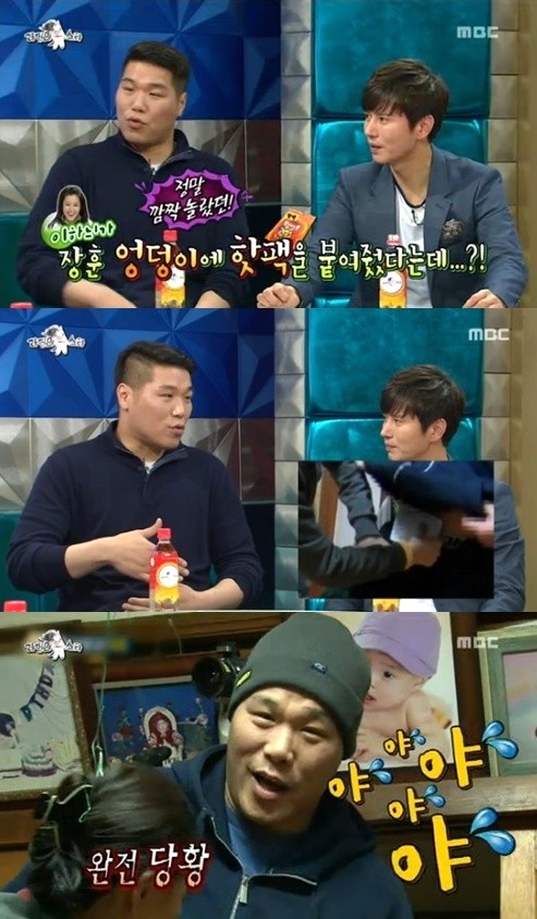 서장훈이 이하늬의 돌발행동에 당황했던 사연을 공개했다.지난 4월 30일 방송된 MBC '황금어장-라디오스타'에는 '등 떠밀려 나온 사람들' 특집으로 배우 김민종, 전 농구선수 서장훈, 방송인 전현무, 걸그룹 씨스타 소유가 출연했다.이날 김구라는 "서장훈과 이하늬가 '사남일녀'에서 굉장히 친하게 지낸다"며 "핫팩을 엉덩이뿐만 아니라 앞쪽도 붙여줬다"고 과거 핫팩과 관련된 에피소드를 언급했다.이에 서장훈은 "솔직히 당시 너무 놀랐다. 일자바지를 입었는데 고무줄을 앞으로 당겨서 아랫배쪽에 핫팩을 붙이니까 당황할 수 밖에 없었다"고 털어놨다.이어 김구라는 "이하늬가 넉살이 좋다. 내 배도 장 마사지를 해준 적이 있다. 그냥 쑥 들어온다"고 이하늬의 털털한 성격을 밝혔다.[서장훈 이하늬 핫팩 언급, 사진=MBC '라디오스타' 방송 캡처]