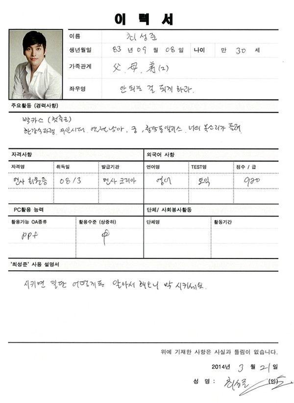 '멘사' 출신 배우 최성준의 이력서가 눈길을 끌고 있다.5월 2일 첫 방송되는 MBC에브리원 '직장생활 공감 리얼스토리-나인투식스2' 홈페이지에 출연자인 김정태, 김대희, 설수현, 수빈, 김민경, 최성준의 자필 이력서가 공개됐다.'나인투식스2'는 6명의 연예인들이 일반 기업에 실제 입사해 평범한 직장 생활 속에서 일어나는 여러 가지 좌충우돌 에피소드를 보여줄 예정이다.공개된 최성준 이력서에는 멘사 출신 답게 '900점이상의 토익 영어점수'와 '중급' 이상의 파워포인트 실력을 자랑하고 있다.이에 선배 사원들로부터 "이 정도면 실제 대기업 입사해도 손색이 없다"는 칭찬을 받았다. 또한, '시키면 어떻게든 할테니 막 시켜달라'라고 씌여있어 앞으로의 활약을 기대하게 했다.MBC에브리원 직장생활 공감 리얼스토리 '나인투식스2'는 오는 2일 금요일 오후 8시에 첫 방송된다.[최성준 자필 이력서 공개, 사진=MBC에브리원]