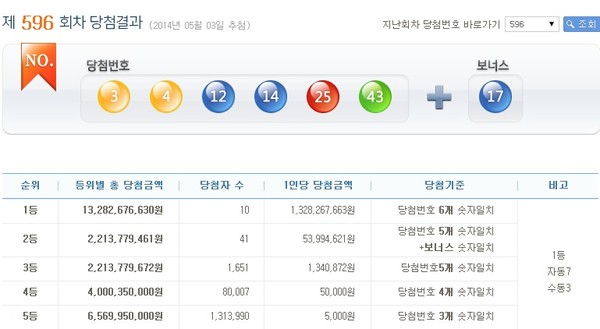 2014년 5월 3일 실시된 제596회 나눔로또 1등 당첨번호는 '3, 4, 12, 14, 25, 43'이며, 2등 보너스 번호는 17번이다.이번 로또 596회차 추첨 결과 1등 당첨자는 10명으로 13억2826만7663원의 당첨금을 받게 됐다.1등 번호 중개와 보너스 번호를 맞힌 2등은 41명이며, 1인당 5399만4621원씩 지급받는다. 당첨번호 중 5개를 맞힌 3등은 1651명으로 당첨금은 각 134만872원이다.5만원의 당첨금을 받는 4개의 번호를 맞힌 4등은 8만7명이며, 5000원의 고정 당첨금을 받는 5등은 131만3990명이 나온 것으로 집계됐다.한편, 이번주 로또596 총 판매금액은 565억6107만1000원이다.[로또596회당첨번호, 사진=로또 홈페이지 캡처]