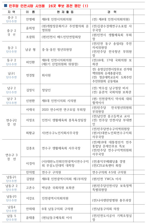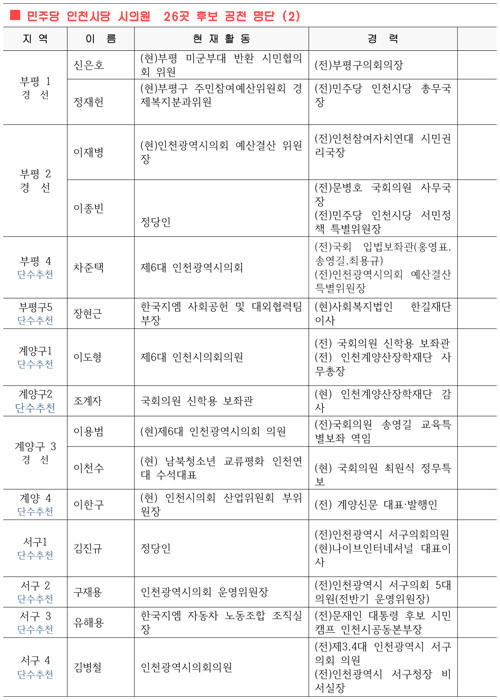 문제는 이뿐만이 아니다. 공천자중 절반이 지역위원장을 맡고 있는 현역 국회의원의 보좌관·특보·사무국장 출신, 시당에 칙잭을 가졌던 인물이라는 점이다. 현역 국회의원 보좌관 출신 5명, 전 국회의원 보좌관 출신은 2명, 국회의원 특보 1명, 국회의원 사무국장 1명이다. 여기에 민주당 또는 시당에 직책을 거친 인물이 4명이다. 여기에 송영길 시장 선대위나 특보 출신도 2명이나 된다.