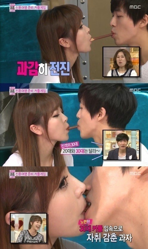 '우결' 남궁민 홍진영 커플이 막대과자 게임 도중 과감한 스킨십을 나눴다.지난 3일 방송된 MBC '우리 결혼했어요4'(이하 우결)에서는 남궁민 홍진영, 장우영-박세영 커플은 신혼여행을 위한 커플게임을 펼쳤다.이날 게임에서 진 커플은 신혼여행지에서 2인3각으로 반나절을 보내야 하는 벌칙이 주어졌다.첫 번째 종목인 막대과자 게임에서 우영 박세영 커플은 막대과자 2cm를 남겼다. 남궁민은 "저 커플은 스킨십도 안해봤다면서..."라며 놀라움을 감추지 못했다.이에 자극을 받은 남궁민은 막대과자를 물자마자 돌진했고, 급기야 서로의 입술이 닿았다. 먼저 입술을 뺀 홍진영은 "볼때랑 할 때랑 느낌이 완전 다르더라"고 밝혔다. 결국 두 사람은 2.5cm로 장우영 박세영 커플에 패하고 말았다.'우결' 남궁민 홍진영 스킨십을 본 네티즌들은 "우결 남궁민 홍진영 방송에서 이래도 돼?", "진격의 남궁민 의외다", "우결 남궁민 홍진영 막대과자 게임 화끈하네", "게임이야 키스야?", "우결 남궁민 홍진영 완전 리얼해" 등의 반응을 보였다.[우결 남궁민 홍진영, 사진=MBC '우리 결혼했어요4' 방송 캡처]