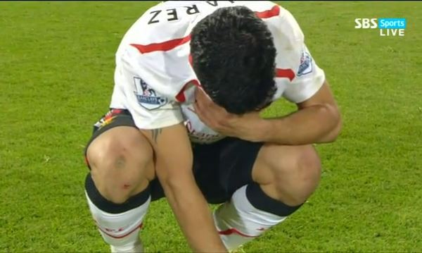리버풀이 크리스탈팰리스전에서 무승부에 그친 가운데 수아레즈가 눈물을 보였다.리버풀은 6일(한국시간) 영국 런던에 위치한 셀허스트파크에서 열린 2013-2014 시즌 잉글랜드 프리머어리그(EPL) 37라운드 크리스탈팰리스와의 원정경기에서 3-3으로 무승무를 거뒀다.이날 리버풀은 전반 18분 조 앨런의 선제골로 기선을 제압했다. 이어 후반 8분 다니엘 스터리지가 추가골을 넣었으며, 2분 뒤인 후반 10분에는 루이스 수아레즈가 31호 골을 성공시키며 3-0으로 앞섰다.하지만 후반 33분부터 상대팀 크리스탈팰리스에 연달아 3골을 내주며 무승부로 경기를 마쳤다. 크리스탈 팰리스는 13승 5무 19패(승점 44)로 11위에 머물렀다.리버풀은 25승 6무 6패(승점 81)을 기록하며 EPL 선두에 복귀했지만 아직 한 경기를 덜 치른 맨체스터 시티(승점 80)와 승점 차가 불과 1점밖에 나지 안아 리버풀의 우승 가능성은 더욱 낮아졌다.세 번째 골을 넣었던 수아레즈는 경기가 끝난 후 고개를 숙인 채 눈물을 흘려 보는 이들의 안타까움을 자아냈다.수아레즈 눈물을 접한 네티즌들은 "수아레즈 눈물 안타까워", "리버풀 크리스탈팰리스 무승부 너무 아쉽다", "리버풀 크리스탈팰리스 무승부.. 리버풀 우승 못하는 거야?", "9분 만에 3골을 내주다니 말도 안돼", "수아레즈 눈물에 나까지 울컥하더라" 등의 반응을 보였다.[리버풀 크리스탈팰리스 수아레즈 눈물, 사진=SBS SPORTS 방송화면 캡처]
