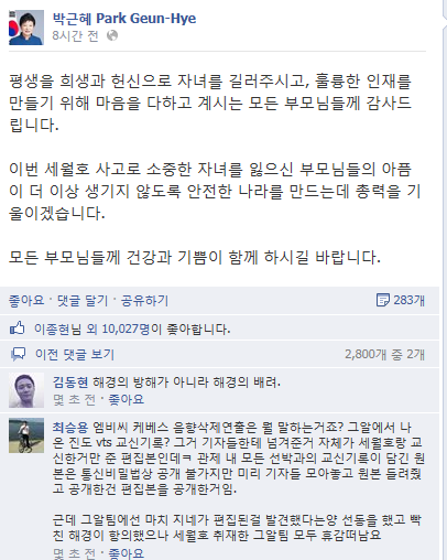 메시지를 남긴 바 있다.박 대통령이 세월호 참사 이후 공식적인 행보 외에도