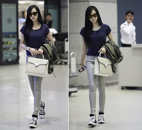 패션매거진 <엘르> 화보 촬영을 위해 중국 상해로 떠났던 에프엑스의 멤버 빅토리아가 지난 7일 인천국제공항을 통해 입국했다.이날 빅토리아는 반팔 티셔츠와 스키니진에 컨버스화를 신은 캐주얼한 차림에 블랙 선글라스와 베이지 색상 토트백 등을 매치해 시크한 매력을 보여주었다.