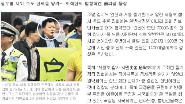특히 서울 청계광장 인근에서 열린 세월호 추모 집회에는 利敵단체 범청학련 前 의장 출신의 윤기진(現 ‘민권연대’ 공동의장)씨의 모습도 보였다고 한다.