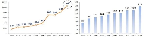 국산제품의 수출가격은 10년 전에 비해 1.9배 증가, 수입산과 격차 감소(2014년 33.8%에서 2013년 60.0% 수준으로 26%p 상승)됐다.