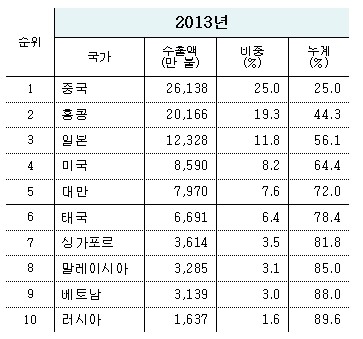 품목별 2013년 수출국을 보면 [기초화장품]은 중국(25%)·홍콩(21%)·일본(12%)의 순,