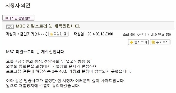 이와 관련 제작진은 사고 발생 1시간 뒤 공식홈페이지 게시판을 통해 해명 및 사과문을 올렸다. 제작진은 "오늘(12일) '금수원의 중심, 전양자의 두 얼굴' 방송 중 외부의 종합 편집 과정에서 기술상의 문제가 발생해 프로그램 결론에 해당하는 2분 40초 가량의 분량이 방송되지 못했다"며 "이와 같은 방송사고가 발생한 점 시청자 여러분께 깊이 사과드린다. 앞으로 재발 방지에 각별히 유의하겠다"고 밝혔다.