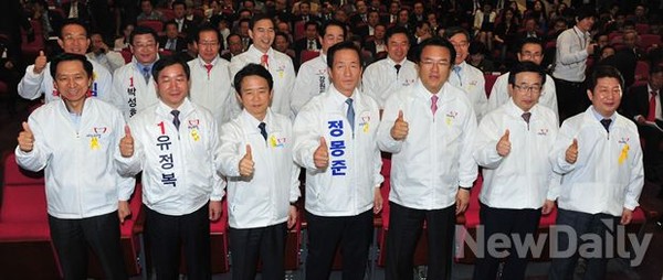 <권영진 대구시장 후보><서병수 부산시장 후보> <정진석 충남도지사 후보> <정몽준 서울시장 후보> <남경필 경기도지사 후보> <유정복 인천시장 후보> <김기현 울산시장 후보> <김관용 경북도지사 후보> <박성효 대전시장 후보> <홍준표 경남도지사 후보> <이중효 전남도지사 후보> <최흥집 강원도지사 후보> <원희룡 제주도지사 후보> <박철곤 전북도지사 후보> <유한식 세종시장 후보> (앞줄 오른쪽 부터)