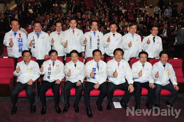 <권영진 대구시장 후보><서병수 부산시장 후보> <정진석 충남도지사 후보> <정몽준 서울시장 후보> <남경필 경기도지사 후보> <유정복 인천시장 후보> <김기현 울산시장 후보> <김관용 경북도지사 후보> <박성효 대전시장 후보> <홍준표 경남도지사 후보> <이중효 전남도지사 후보> <최흥집 강원도지사 후보> <원희룡 제주도지사 후보> <박철곤 전북도지사 후보> <유한식 세종시장 후보> (앞줄 오른쪽 부터)
