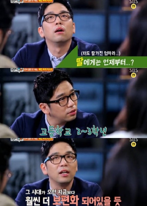 이에 MC 문소리는 "그럼 딸에게 피임기구에 대해 언제 이야기 해줄거냐?"라고 돌직구 질문을 했고, 조금 당황한 이적은 "고등학교 2~3학년쯤 되면 내가 말해 줘도 괜찮을 것 같다"라고 조심스레 답했다.