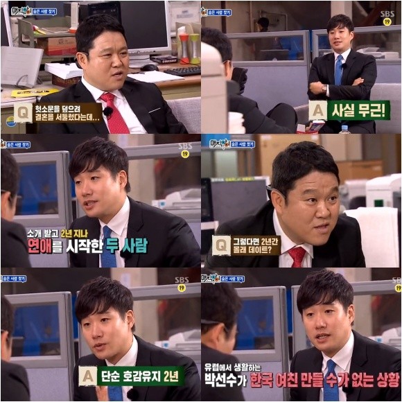 SBS 배성재 아나운서가 '매직아이'에서 박지성 김민지 커플을 언급했다.김구라는 13일 방송된 SBS 새 파일럿 예능 프로그램 '매직아이'의 코너 '숨은 사람 찾기'에서 배성재 아운서에게 "일각에서 헛소문을 덮으려고 결혼을 서둘렀다는 얘기가 있다"고 운을 뗐다.이에 배성재는 "아니다"라며 "내가 박지성과 김민지를 서로에게 소개하고 2년 후 연애를 시작했다"고 밝혔다.그러자 김구라는 "그렇다면 2년간 몰래 데이트를 한거냐?"라고 물었고, 배성재는 "몰래 데이트는 아니고 안 사귄 상태에서 서로 호감만 갖고 있었다"고 답했다.이어 "박지성 선수가 유럽에 있어 한국에 있는 여자와 데이트 하기 어려웠다. 한국에 와서 누구를 만나고 연애로 발전할 시간이 너무 짧았다"고 덧붙였다.하지만 김구라는 "그럼 기성용은 어떻게 만난 거야?"라고 응수해 배성재 아나운서를 당황케 했다. 배성재는 "세대가 조금 차이가 난다. 사람에 따라 다르지 않냐"며 설명했고, 김구라는 "박지성이 차범근 세대도 아니고 말이 되냐"고 맞받아쳐 웃음을 자아냈다.['매직아이' 배성재 박지성 김민지 언급, 사진=SBS '매직아이' 방송 캡처]