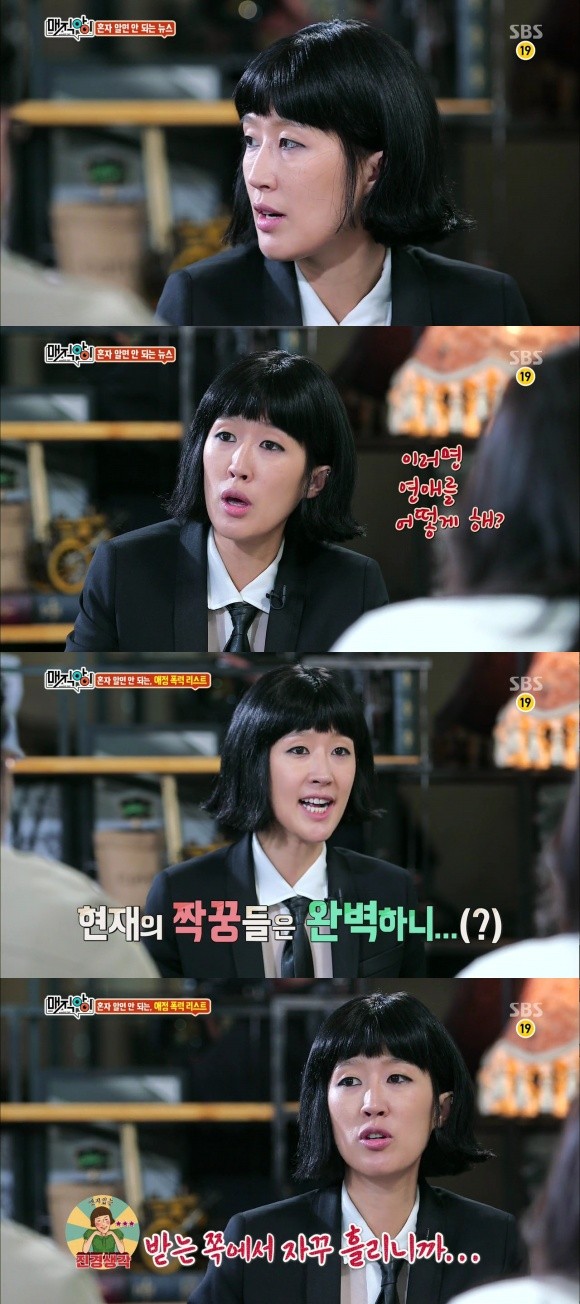 '매직아이' 홍진경이 남다른 입담을 뽐냈다.홍진경은 지난 13일 첫 방송된 SBS 새 파일럿 예능프로그램 '매직아이'에서 가수 이효리, 배우 문소리, 칼럼니스트 임경선과 함께 MC로 나서 쉴 새 없이 쏟아지는 에피소드를 일목요연하게 정리하며 프로그램의 진행을 이끌었다.이날 홍진경은 "헤어진 후 만취해서 매달리면 애정폭력이다", "가요 '너를 위해'는 데이트 폭력을 대표하는 위험한 노래. 이 노래 때문에 남자들이 폭력적인 성향을 '멋있음'으로 착각한다" 등 기발하고 참신한 해석을 내놓았다.특히, 홍진경은 현재 시행 중인 데이트 폭력 법에 반기를 들며 격분하며 자신이 직접 사전 조사한 다양한 뉴스와 자료를 공개하는 등 철저한 준비와 해박한 지식을 앞세워 '매직아이' 토크의 밀도를 높였다.한편, 시청률 조사기관 닐슨코리아에 따르면 '매직아이'는 시청률 3.8%(이하 전국기준)를 기록했다. 동시간대 방송된 KBS 2TV '우리동네 예체능'과 MBC 'PD수첩'은 각각 5.7%, 4.6%를 나타냈다.[매직아이 홍진경, 사진=SBS '매직아이' 방송 캡처]