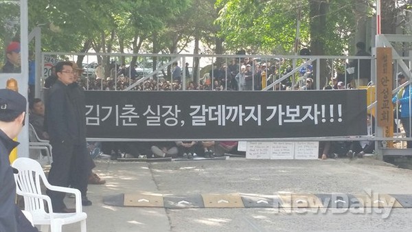 정문에는 500여명의 신도들이 집결해 찬송가를 부르며 만일의 사태에 대비하고 있다. 앞열에는 여성들과 사이사이 유모차도 보여 강제 진입에 부담이 될 것으로 예상된다.