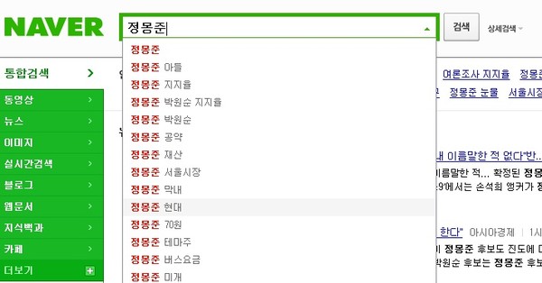 문제는 자동으로 노출되는 연관 검색어 대부분이 '부정적인 단어'들이라는 점. 예를 들어 정몽준 후보의 이름을 치면, 얼마 전 곤욕을 치른 '아들'과 관련된 단어들이 검색어 목록에 나오는 것을 볼 수 있다. '아들' '막내' '미개' '버스요금' 등, 정 후보에겐 부담스러울 수밖에 없는 단어들이 자동적으로 노출되고 있다.