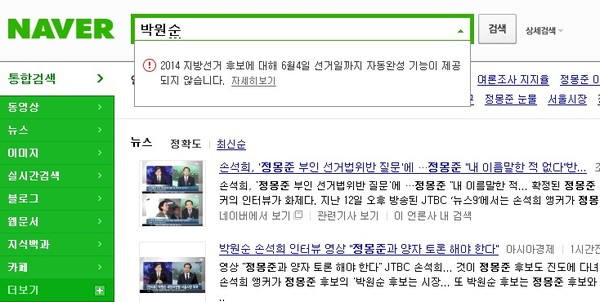 도마 위에 오른 포털사이트는 국내 최대 이용자수를 자랑하는 NHN의 네이버. 16일 현재 새정치민주연합의 박원순 서울시장 후보와 김진표 경기도지사 후보의 이름을 네이버 검색창에 입력하면 "2014 지방선거 후보에 대해 6월4일 선거일까지 자동완성 기능이 제공되지 않습니다"라는 문구가 뜬다.