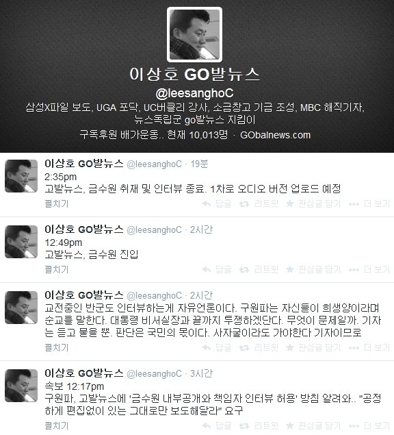 잠시후 이 기자는 "고발뉴스, 금수원 진입"이라는 메시지를 트위터에 올려 네티즌의 시선을 집중시켰다. 그러나 금수원 관계자에 따르면 이 기자는 1,000여명의 신도가 집결한 금수원 내부가 아닌, 인근 목장에서 리포트를 한 것으로 전해졌다. -