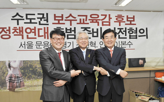 서울 문용린, 경기 조전혁, 인천 이본수 등 수도권 보수성향 교육감 후보들이 19일 한자리에 모여 "이번 6.4 지방선거에서 반드시 종북‧좌파세력을 물리치겠다"고 밝혔다.
