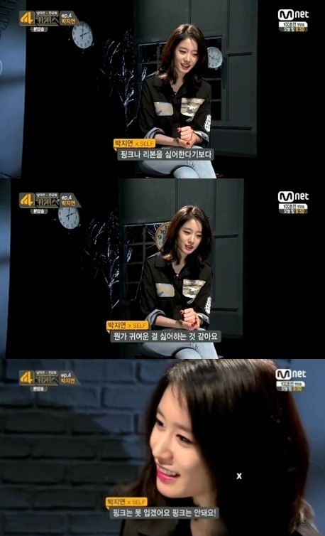 솔로로 돌아온 티아라 지연이 핑크색 기피증이 있음을 고백했다.지연은 지난 20일 방송된 Mnet '발칙한 인터뷰 4가지쇼'에 출연해 "귀여운 것을 싫어한다"고 털어놨다.이날 티아라 멤버 효민은 지연에 대해 "여성스러운 모습은 찾기 힘든 것 같다"고 밝혀 이목을 끌었다.이에 지연은 "핑크나 리본이 싫다기보다는 뭔가 귀여운 걸 싫어한다"며 "내 몸에 블랙이 하나는 있어야 자신감이 생긴다. 블랙이 없으면 안 된다"고 단호하게 말했다.이어 "핑크는 못 입겠다. 핑크는 안 된다"고 강조하며 귀엽고 예쁜 이미지와 다른 반전 매력을 드러냈다.방송을 접한 네티즌들은 "지연 1분 1초 응원할게요", "지연 이런 모습 의외다", "지연 1분 1초 노래 좋더라", "지연 핑크랑 완전 잘 어울리는데..", "앞으로 솔로 활동 기대된다", "지연 1분 1초 블랙의상 이유 있었네" 등의 다양한 반응을 보였다.한편, 지연은 이날 정오 첫 솔로 앨범 'Never ever'의 타이틀곡 '1분 1초' 음원과 뮤직비디오를 공개했다. '1분 1초'는 히트메이커 작곡가팀 이단옆차기의 작품으로 서정적인 가사와 멜로디 그리고 사랑하는 남자를 절대 포기 할 수 없다는 간절한 마음이 표현된 곡이다.[지연, 사진=Mnet '4가지쇼' 방송 캡처]