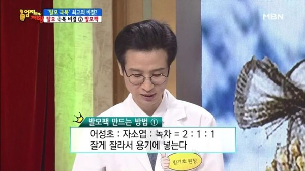 탈모 전문의원인 <방의원>의 방기호 원장은 지난 4월 22일 방영된 종합편성채널 MBN <엄지의 제왕> 탈모 극복 프로젝트편에서 탈모를 극복할 수 있는 비법으로 [발모차]와 [발모팩], [발모식단]을 공개했다.