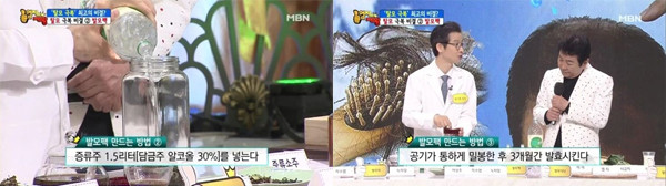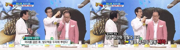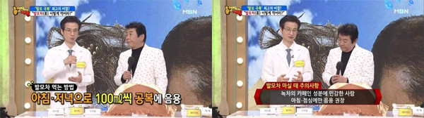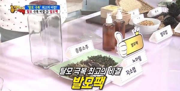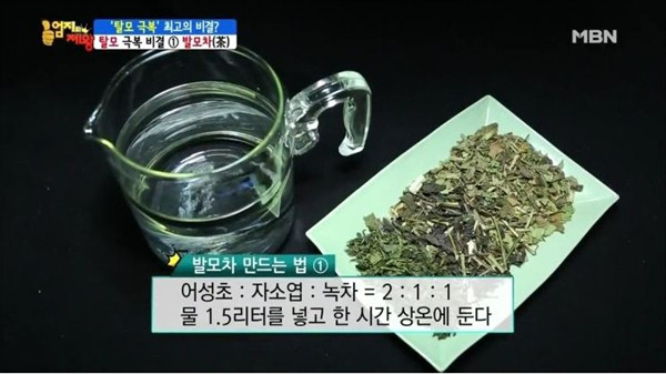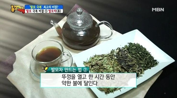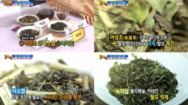 이날 소개된 탈모 예방을 위한 [발모차]는 어성초와 자소엽, 녹차잎을 섞어 만든 것으로 어성초와 자소엽, 녹차잎은 발모에 좋은 대표적인 식물들이다.[어성초]는 전통적으로 한의학에서 청혈, 해독작용에 사용되며 아토피 피부에도 효과적인 약초이다.