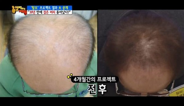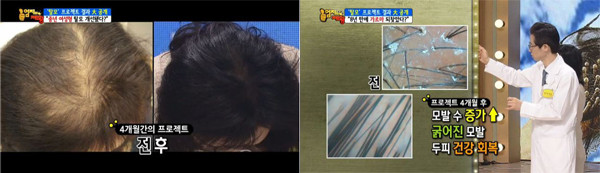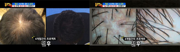 효과를 보여 주기 위해 염색을 한 것이지만 프로젝트 진행 후 새로 나는 머리카락들은 검은 모가 많고 심각했던 탈모 상태가 놀랍게 호전돼 패널들의 반응도 뜨거웠다.