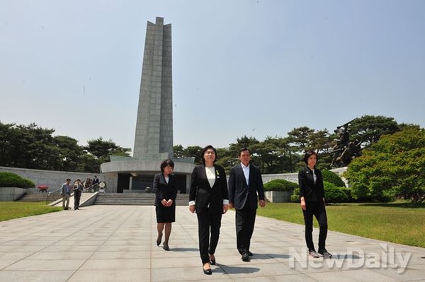 공식선거운동 첫날 새누리당 <조은희>(왼쪽에서 두번째) 서초구청장 후보가 22일 오전 국립서울현충원을 방문해 호국영령에 대한 참배를 마치고 내려오고 있다.