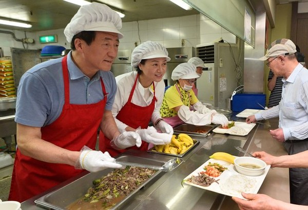 새누리당 정몽준 서울시장 후보가 23일 오전 서울 영등포구 노인종합복지관에 방문해 어르신들에게 배식봉사를 하고 있다.
