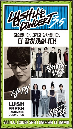 이에 러쉬는 고객들의 상한 마음을 위로하기 위한 스페셜 콘서트 [러쉬 냄새나는 콘서트3.5]를 오는 6월 1일 일요일 오후 5시 잠실 올림픽 공원 내 올림픽 홀에서 개최한다고 밝혔다.