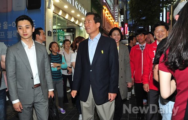 거리 유세 활동에 나선 새누리당 정몽준 서울시장 후보가 부인 김영명씨과 함께주말을 앞둔 23일 오후 명동 거리를 걷고 있다.