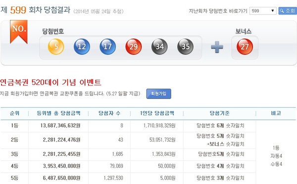2014년 5월 24일 실시된 제599회 나눔로또 1등 당첨번호는 '5, 12, 17, 29, 34, 35'이며, 2등 보너스 번호는 27번이다.이번 로또 599회차 추첨 결과 1등 당첨자는 8명으로 17억1091만8329원의 당첨금을 받게 됐다.1등 번호 중개와 보너스 번호를 맞힌 2등은 43명이며, 1인당 5305만1732원씩 지급받는다. 당첨번호 중 5개를 맞힌 3등은 1685명으로 당첨금은 각 135만3843원이다.5만원의 당첨금을 받는 4개의 번호를 맞힌 4등은 7만9069명이며, 5000원의 고정 당첨금을 받는 5등은 129만7530명이 나온 것으로 집계됐다.한편, 이번주 로또599 총 판매금액은 573억8179만1000원이다.[로또599회당첨번호, 사진=로또 홈페이지 캡처]