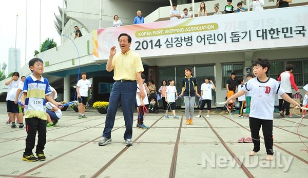새누리당 정몽준 서울시장 후보가 부인 김영명 여사와 함께 24일 오전 서울 송파구 잠실학생체육관에서 열린 2014 심장병 어린이 돕기 줄넘기대회에 참석해 아이들과 줄넘기를 하고있다.