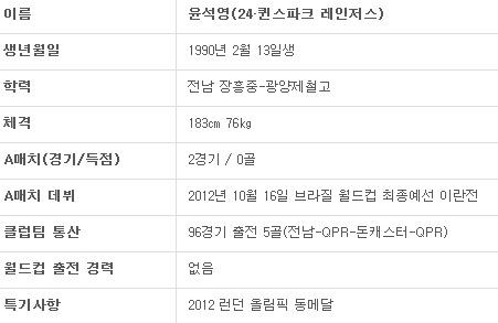 소속팀인 퀸스파크 레인저스(이하 QPR)를 잉글랜드 프리미어리그로 승격시키는데 일조한 윤석영이 대표팀에 합류, 23인의 태극전사가 모두 한 자리에 모이게 됐다.