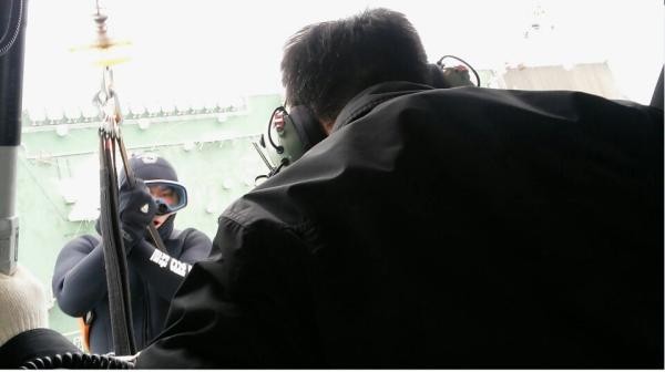 權 경장은 다시 좌현으로 헤엄쳐 갔다. 배가 기울면서 5층에 동굴 같은 공간이 생겼다. 캄캄한 안으로 헤엄쳐 들어가면서 벽을 더듬었다. “사람 있으세요”라고 소리치면서 한 30m까지 들어갔다가 나왔다. 아무도 없었다. 나오니 배는 덮쳐 내리듯이 기울고 있었다. 船尾(선미) 쪽으로 헤엄쳐 이동했다. 사람들이 수직으로 변한 난간을 잡고 매달리다시피 버티고 있었다. 수십 명이었다. 권 경장은 오리발을 벗고 난간 쪽으로 올라가 탈출을 도왔다. 접근한 배에 옮겨 실었다. 이때 쯤 어업지도선, 어선 등이 세월호로 많이 와 있었다. 약 30명을 옮겼다.