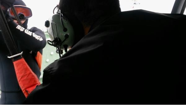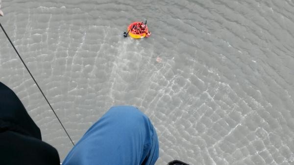 사진 4: 헬기에서 던진 구명벌에 사람들이 타고 있고, 검은 옷 입은 권 경장이 붙어 있다.