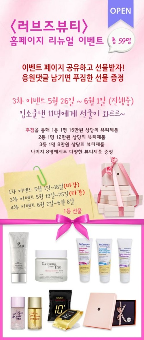 러브즈뷰티 리뉴얼 이벤트는 총 4차에 걸쳐 진행되며, 총 59명에게 120만원 상당의 뷰티 제품을 증정한다.