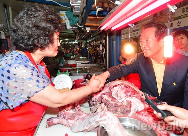 정몽준 새누리당 서울시장 후보가 27일 오후 서울 성동구 마장축산물 시장을 방문해