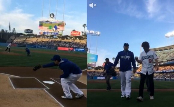 한국 최초 메이저리그에 진출한 '코리안 특급' 박찬호가 LA다저스 시구자로 나섰다.박찬호는 28일(한국시간) 미국 캘리포니아주 로스앤젤레스 다저스타디움에서 열린 '2014 메이저리그' LA 다저스와 신시내티 레즈와의 경기에 앞서 시구를 던졌다.이날 씨엔블루 정용화가 애국가를, 알리가 미국 국가를 제창했으며, 뒤이어 6년 만에 LA 다저스 유니폼을 입은 박찬호가 마운드에 입장했다.포수 역할을 맡은 류현진도 마운드에 올라 박찬호의 공을 받았다. 박찬호는 시구를 마친 후 류현진과 따뜻한 포옹을 나누며 훈훈한 모습을 보여줬다.박찬호 시구는 한국관광공사 주관으로 열린 '코리아 나이트'(한국의 밤) 행사의 일환으로 이뤄졌으며, 박찬호는 시구 전 팬들에게 사인회를 열기도 했다.[박찬호 시구, 사진=LA다저스 트위터 영상 캡처]