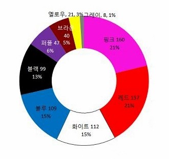전년도 출원건수와 비교해 볼 때 핑크는 162%, 퍼플 135%, 블루 127%로 대폭 증가했다.